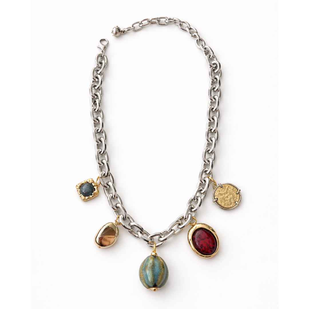 Com design cheio de elementos e informação de moda, o Colar Chunky traz uma corrente robusta em ródio com mix de pingentes dourados em diferentes formatos e tamanhos, criando um visual dinâmico, moderno e super atual. O resultado é uma peça muito cool, que adiciona textura e movimento ao look sem esforço.